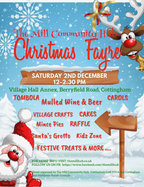 The Mill Community Hub, Cottingham CofE PTFA and Cottingham and Middleton Parish Councils are hosting a Christmas Fayre on Saturday 2nd December 12pm-2.30pm at the Village Hall.
