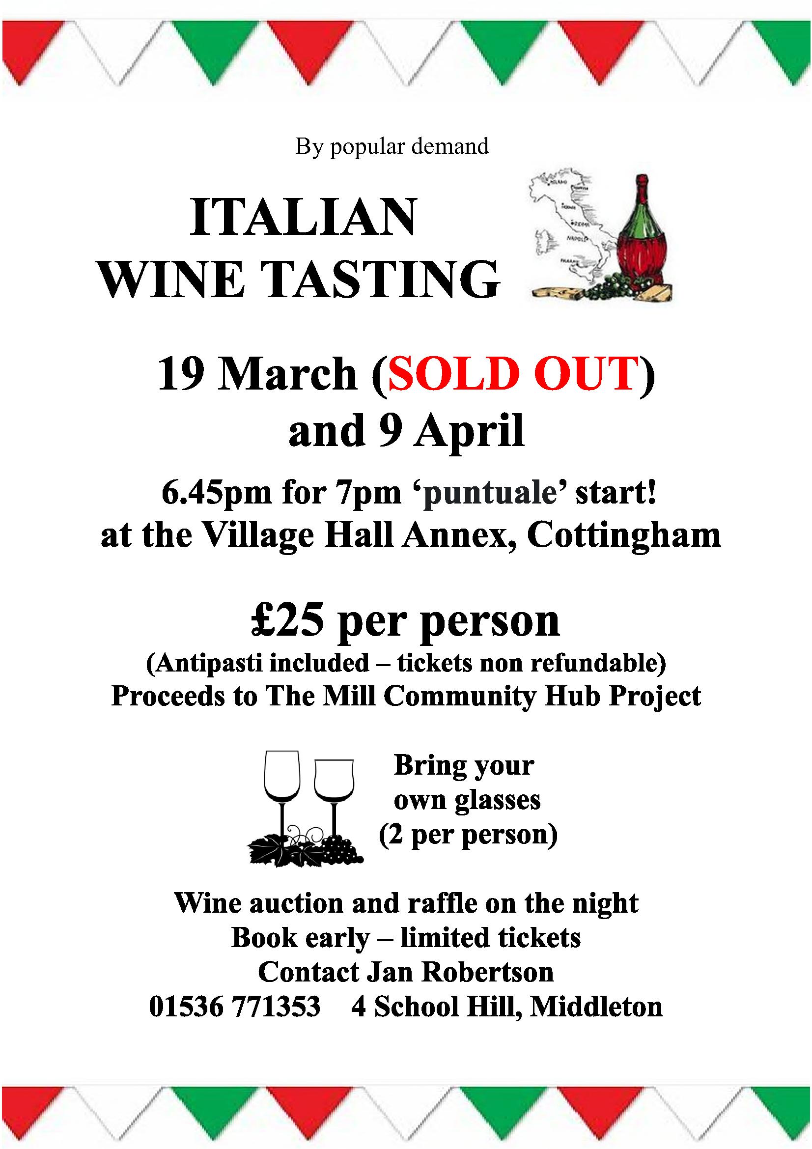 Come along to the Village Hall Annex for a Italian wine tasting. All you need to bring are yourselves and wine glasses – two each please (one for red wine, and one for white).